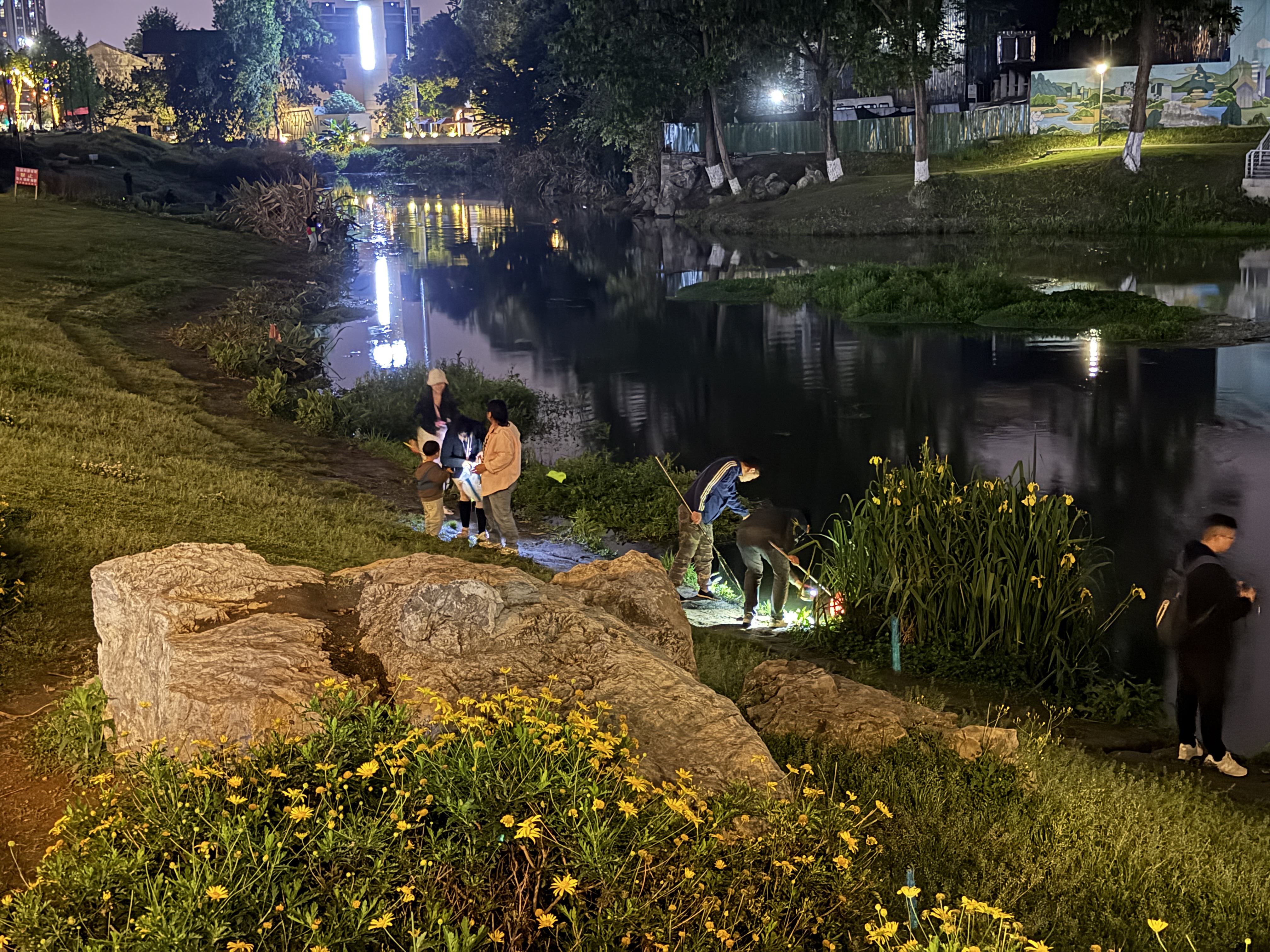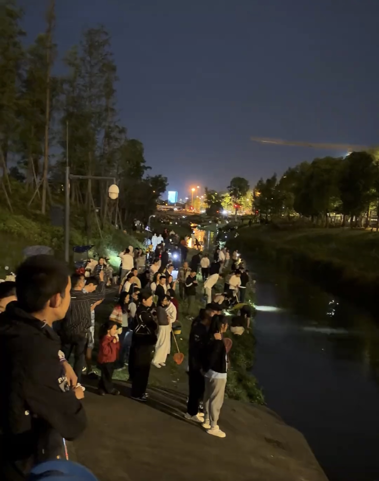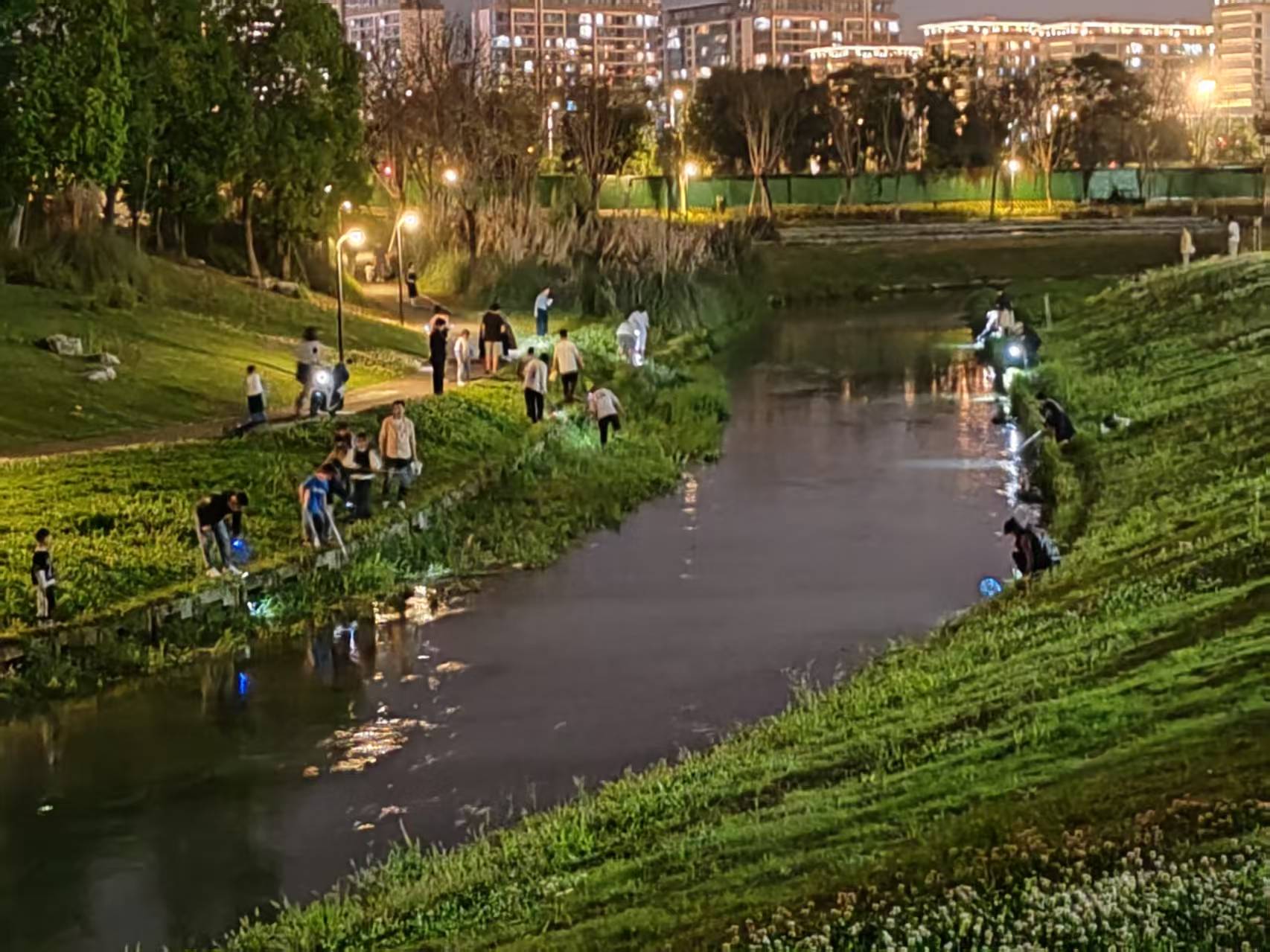 4月13日晚7点,封面新闻记者在现场看到,利民路附近每条河道周围都有捞虾人群,不过与视频中“人挤人”的画面不同的是,现场人并不算多,有零星的“捞虾人”和围观群众,未见到大规模捕捞的现象。