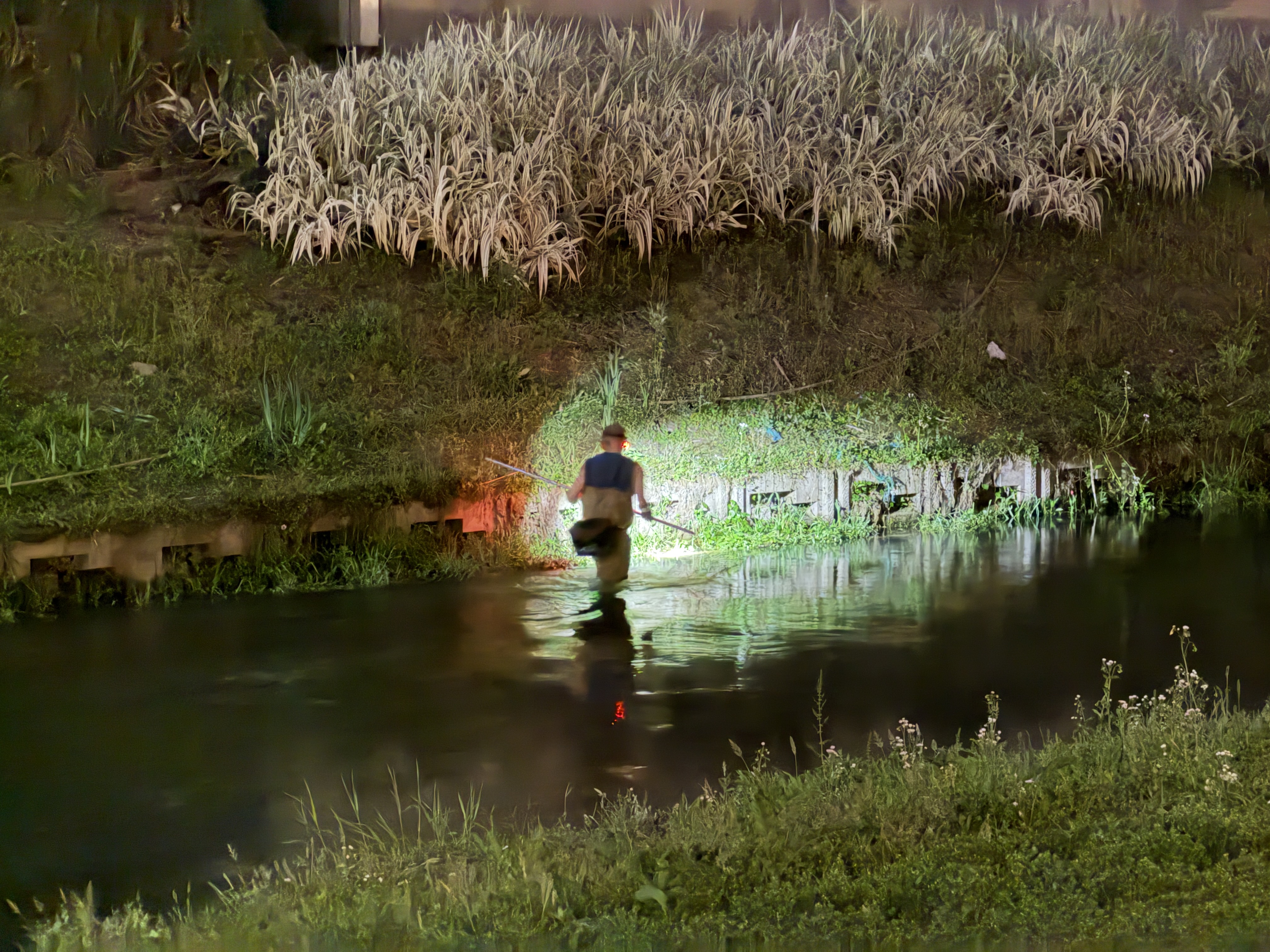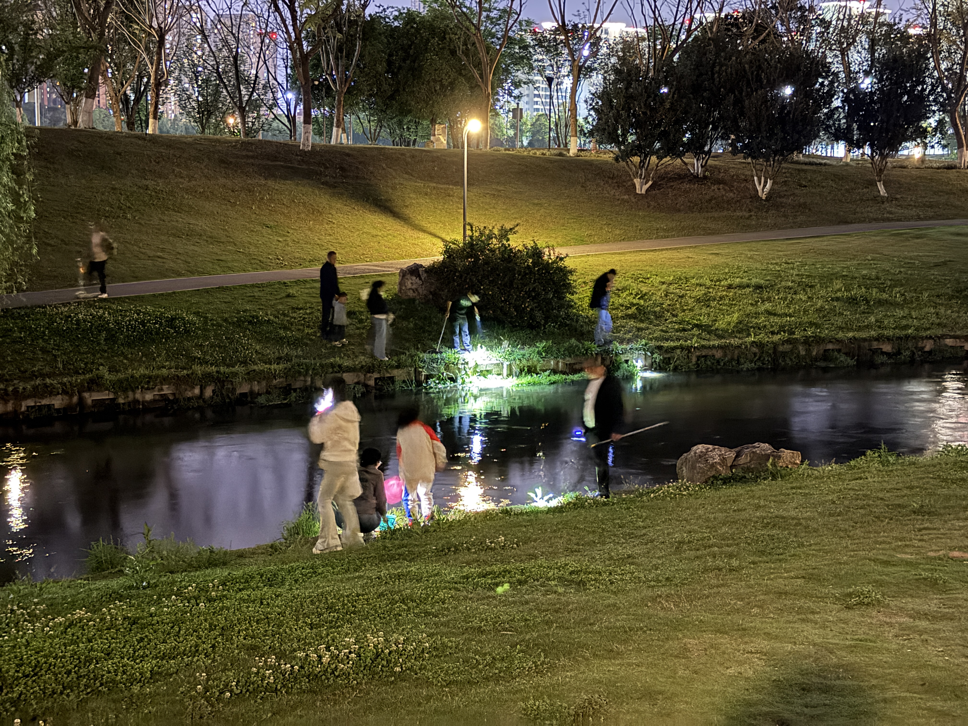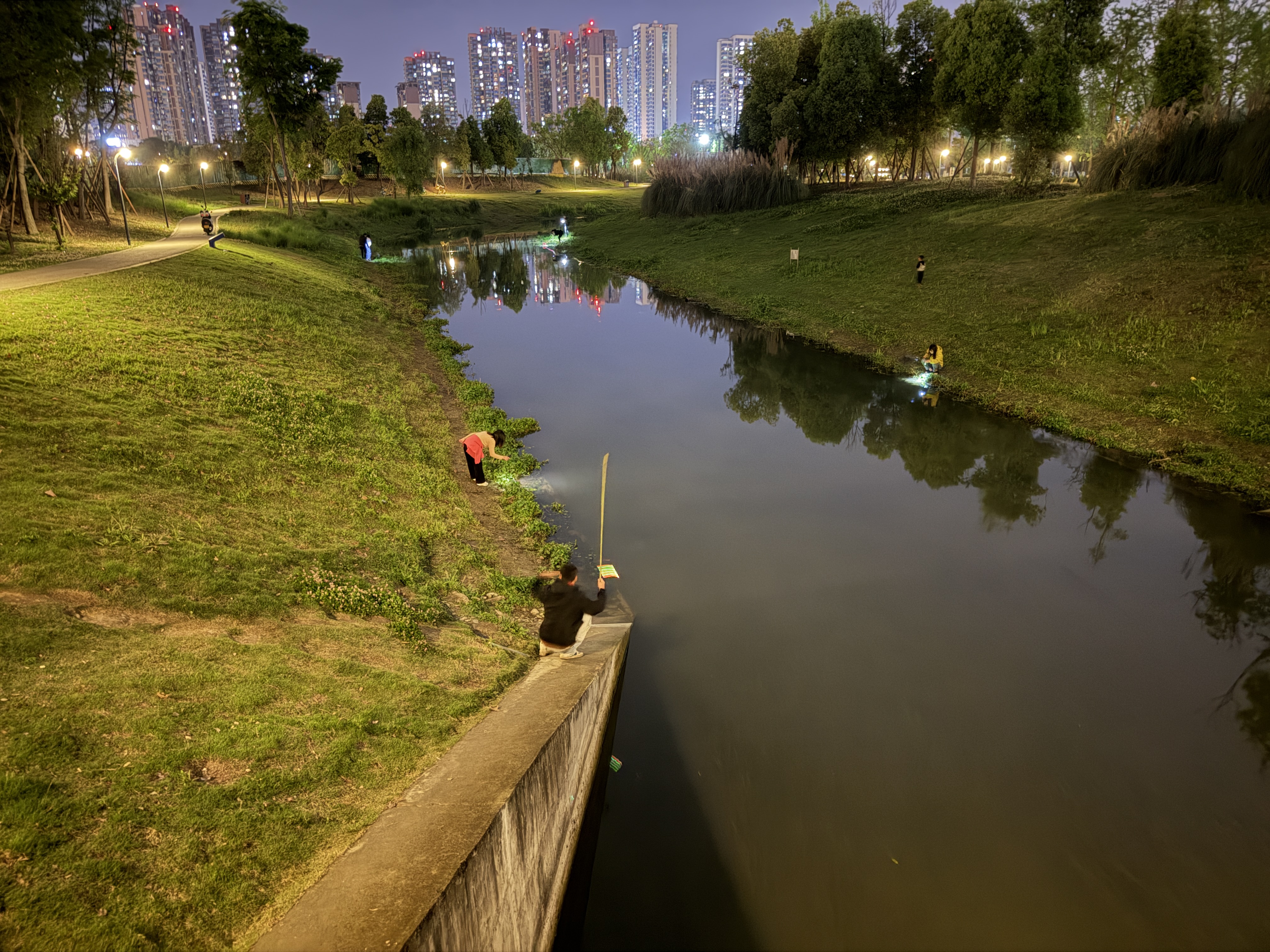 “你看嘛,这就是我前几天发在家人群里的照片,人可多了。”水无界悦动园的公园位于记者探访河道一旁,公园安保人员向记者表示,他在19点至次日7点的通宵值守巡逻时,发现有人凌晨2点前来捕捞,有时凌晨5点也还有人。