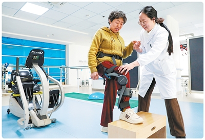 4月7日,江苏省海安市中医院康复训练中心,患者正在治疗师指导下穿戴外骨骼机器人进行康复训练。 顾彬斌摄(影像中国)