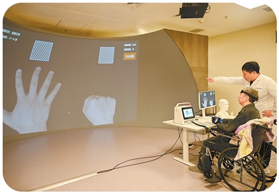 4月7日,贵州省贵阳市,北京积水潭医院贵州医院医生在指导患者进行脑机接口康复训练。 袁福洪摄(影像中国)
